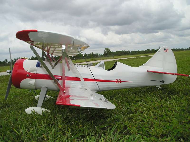 The rain finally stopped, and the winds went calm, and I test flew the new Waco 60 Bipe Sunday! What a sweet flyer! With a Magnum .91 4stroke under the cowl, the plane is not under powered. Slowly advancing the throttle to avoid ground loops, she was off the runway by the time I reached 1/2 throttle. Didn't need to worry about ground loops though, ground handling is rock solid! Needed some down trim to keep her from climbing so much, but when inverted, no down was needed. I have moved the CG forward with a 2 oz. brass hub to see if elevator trim will come back to neutral. Will find out next Saturday. This is one beautiful plane....will post picture tomorrow.