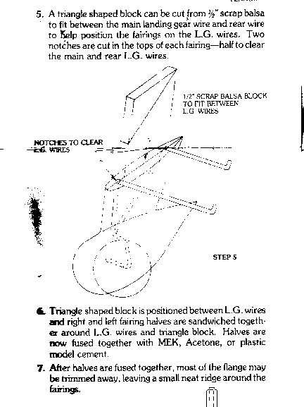 The landing gear wire is reinforced with a balsa triangle piece wedged between the leading and trailing wire of gear. The balsa is secured with fiber-glass which is saturated with medium CA. The pants fit over the assembly without a hitch and if needed in future the wheel pant can be secured to balsa for more stability.