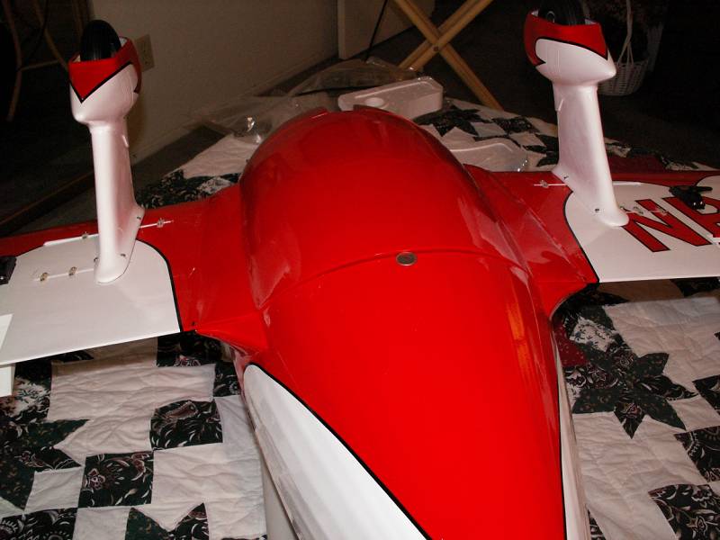 The only problem in the build was the belly pan was not a very good fit. I am using Hitec HB325 servos all round. For the throttle I have installed a servo inside the cowel on the firewall, which even though is soaked in oil works fine. It flys like a dream and I didn't have to add any ballast at all. the CG is as per instructions, it does anything you ask of it and knife edges forever. The only problems I have had is when landing on long grass I have had 2 problems, the first is the screws that hold the wheel pants on started to come loose so I put longer ones in which sorted it. The other is the wheel pants have started to crack on the front join at the bottom so I would advise putting some glass cloth to strengthen the area.