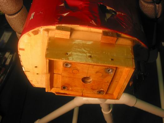 Remove the small balsa tri stock at the engine box and install 1/2" balsa tri strock after adding 1/8 plywood doublers at all exterior sides of the mount box.