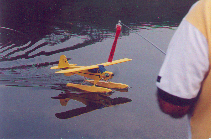 The Cub is a Goldberg kit and the floats are also Goldberg floats. I built them up from a balsa and lite ply kit. I put metal from a couple of tin cans at the high contact points and I can taxi it on to the stony beach at the lake with no concern. I have an O.S. .91 4cycle up front.