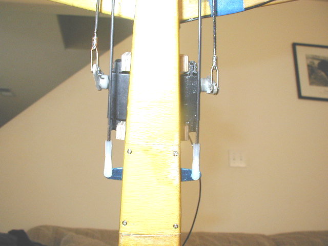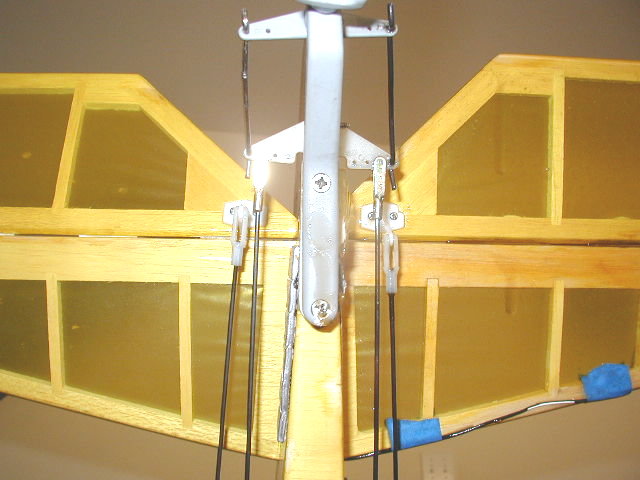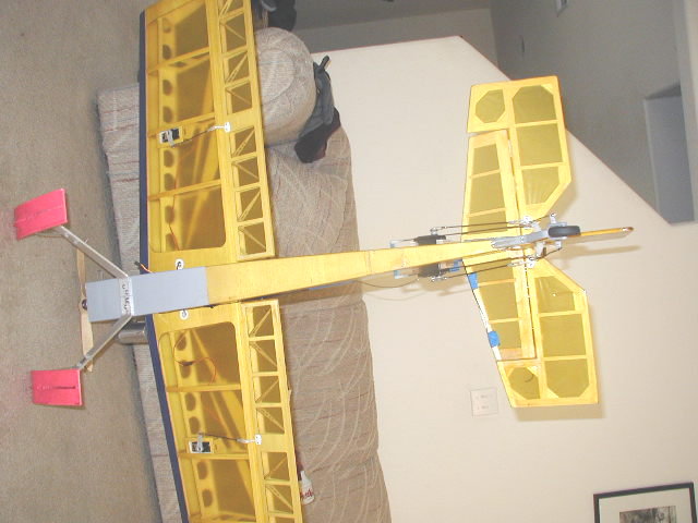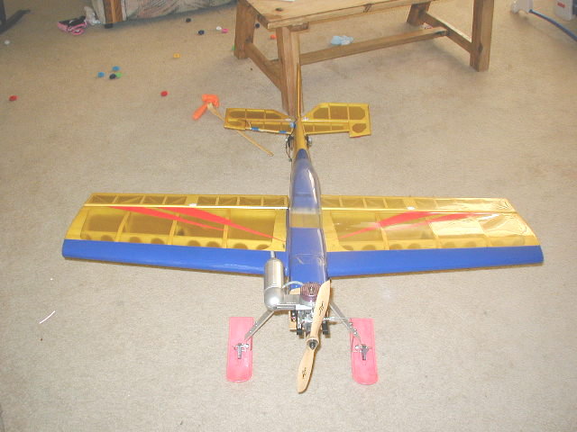 It does have 2 issues that needed fixin. The main gear is wires and the wheels wobble around and it's kinda floppy. The tail only has a wire skid-- not a tailwheel. I added a piece of hard plywood on the main gear mount and installed some real aluminum gear. I added a steerable tailwheel as well.