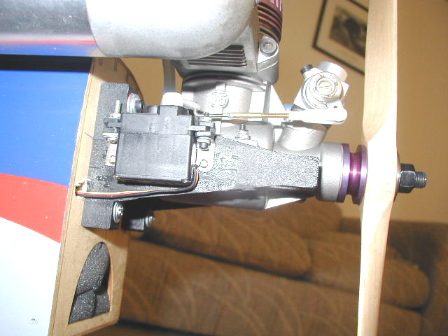 Throttle servo is Hitec HS-81. I used some flying wire straps and bent them into an angle. Then I bolted them to the servo and used small wood screws to mount the servo to my engine mount. Linkage is short and sweet.
