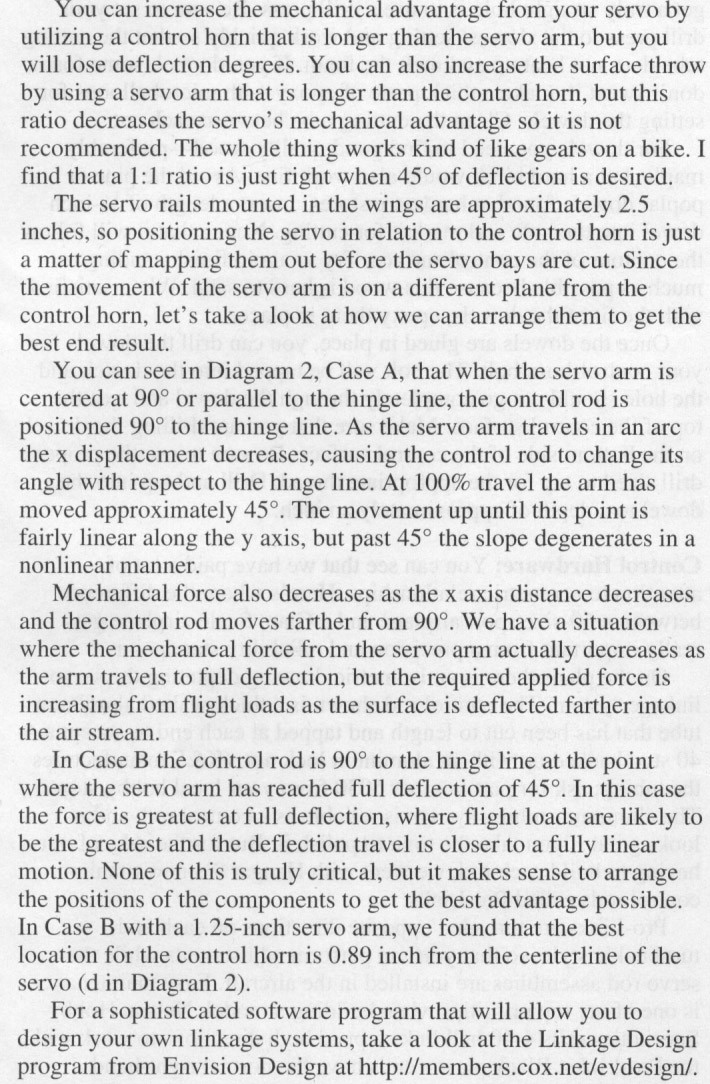 Actually the horn should be placed closer to being inline with the servo shaft, but not perfectly inline if you want the best mechanical advantage at full throws (both up and down). If anyone has a bigger picture than mine please post it. Mine is hard to see. Having the control rod at 90 degrees when the surface is at center gives you the most force only at center. At full deflection it is minimum and that's where you need it especially for 3D.