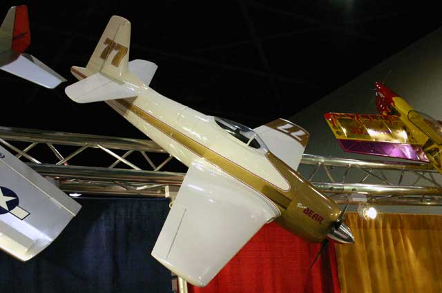 Rare Bear flew last Saturday and Sunday! All up weight 11.2 lbs. Used TT .60 size retracts, with 440 linkage rods. Fuel tank location had to be changed as it was aft of the center of gravity. Fast fast fast with the Pro 120! Ground handling is great, takes off with very little rudder correction. Flies knife edge almost level! Pulled enough "G"s in left pylon turns to strip the HS75 retract servo! Landed on the tailwheel and muffler exhaust pipes for no damage!