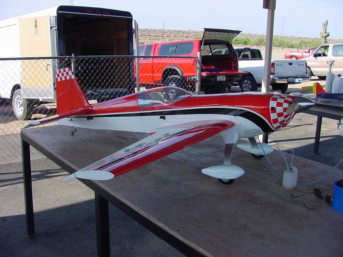 Mine is the purple/white/green color scheme. It feels light but sturdy. The finish is a 9 out of 10 and very well done. Excuse me for comparing but I just built and flew a DP Extra and although I love it dearly, I did a lot of work making it a gasser with all the mods required to keep up to snuff. With the WM Extra, I'm going with the 1.60 as prescribed by World. Just got a Turbo-Jet muffler to help it along, a 20x7 prop is possible with that combo I'm hearing. The plane is setup for the 1.60 with mounts, engine box dimensions and cowl openings. Sub-firewall is glassed over plywood. The wings are sheeted out to mid-span and all ailerons, stabs, elevators, fin and rudder are all sheeted. The big 3D tail surfaces are just as big as the DP Extra, with ailerons only 3" wide instead of 3.75" wide and 50% less bevel-gap. I like that, roll rate versus flutter is the trade off, still very adequate. The fuse sides are sheeted with the only open framework on the bottom. The canopy and hatch are no brainers except for the included pilot which is 1/4" too tall for the canopy. The fuse is noticeably shorter than the DP model and in no way looks like it will be tail heavy. The landing gear feel killer sturdy with excellent wheel pants and fairings. Chunk the tail gear. Get this, you get an aluminum 3.5" spinner in the kit with adapter, not too shabby. Metal hinges are supplied to replace the C/A ones already inserted. All flying surfaces are thinner airfoils than the DP Extra. A friend maidened his PW color scheme this weekend and I was very pleased with the flying characteristics with his 1.60 running very rich. Landings were floaters. His plane was kit stock pull-pull, standard 4-40 rods, horns from kit with GP clevises and the plane balanced with stock radio placement. 2 clicks of down trim and the dude was doing rolling circles. The removable stab mount was unpleasant for him so he glued'em on. Me, I'm anal about the hardware and will do the Central hobbies pulls with ball/swivel links on everything to get repeatable 3D movements. No on-board glow needed with the 1.60. Here's some pics so far.