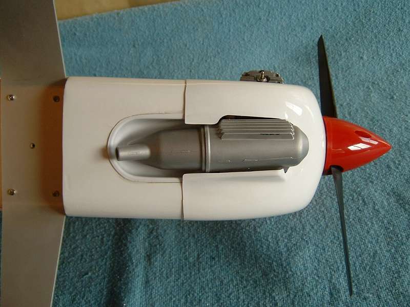 I mounted the muffler and cleared out the bottom of the cowl to fit. The cowl is now screwed in place too. You can clearly see the concave bubble that get installed if you choose to mount the engine this way. The muffler fits perfectly in this pocket. Overall I like the look. It's not quite as nice as a proper in-cowl muffler, but it doesn't stick out like normal, and the rest of the engine is nicely covered. Just the head popping out. I'd still prefer an inverted completely cowled engine, with an inverted pitts muffler, but nobody makes a good invereted pitts for these small engines.