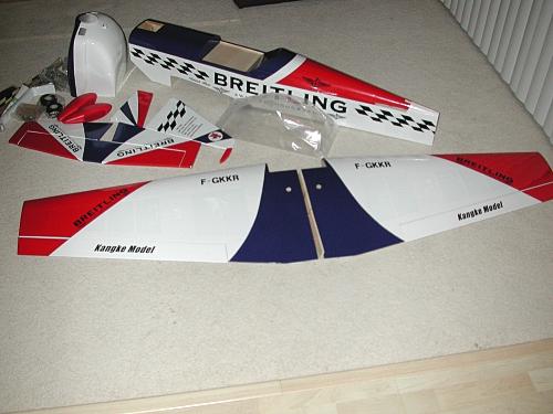 The wing panels and tail feathers are built-up and very light. The construction, covering job, paint work, and quality of wood are excellent! The hinges are already installed and ready for CA. The blind nuts for the landing gear are installed, as well. There are strings through the wings to make the servo cabling easy. The decals have already been applied!