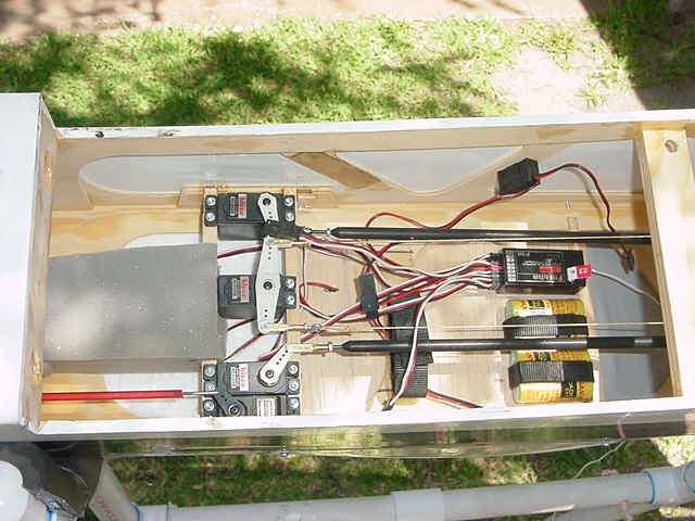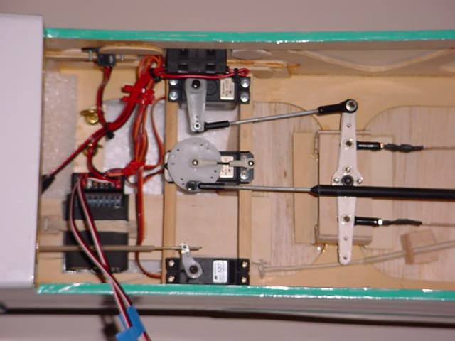 Anyway, the use of a bellcrank allows the rudder servo to be offset so the elevator servo can be centered, while keeping the bellcrank for the rudder centered as well. Ya just have to think in three dimensions...<BG>