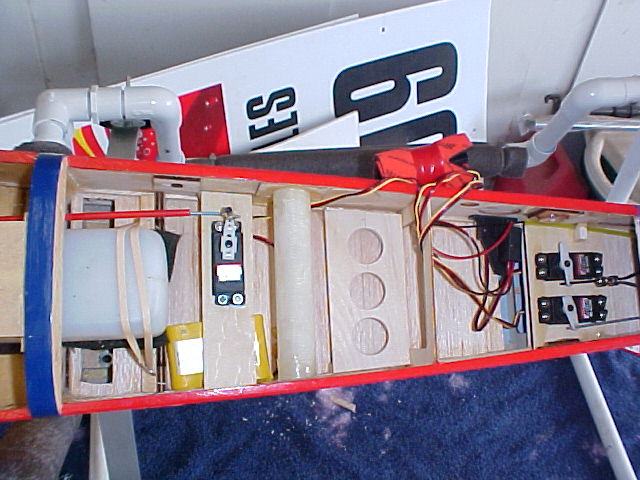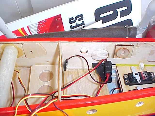After the wings were done, I used the same jig to drill a 1/4" hole thorugh the fuse where the bolts will pass. A test fitting showed everything was indeed lined up, so I grabbed a couple of pieces of scrap lite ply, and 30min epoxied it into the fuse to act as a doubler where the bolt is going to go - I also liberally coated my discs where the aft antirotation pin sits. I fabbed up a receiver tray, and currently have a 1000mah 4.8V battery strapped to the throttle servo mount. All servos are Hitec 425 ballbearing standards. The included wheelpants are almost identical in size as the pants from a Great Planes U Can Do 46 - and you can buy those from Tower for around $14 a pair - the red they come painted in will allmost match the red on this plane anyway.