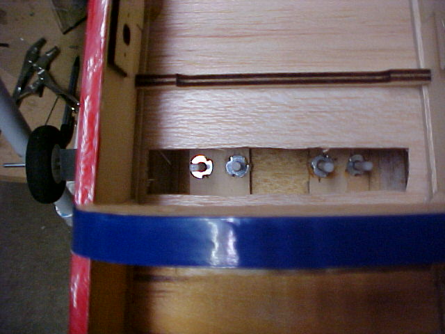 Few little things I changed - I installed some DuBro 5/32 axles for the LG - I just don't like the "bolt through the LG" axle setup on any model. When tightening the 4mm bolts that held the LG halves to the fuse, one of the blind nuts stripped out. I knocked all 4 stock blinds out, and replaced with 1/4-20 blinds, and nylon bolts. I had to cut through the sheeting in the fuse radio compartment to get access to the blinds and LG block. LG block looks sturdy, and is 2 pieces. Good amounts of epoxy visible on all.
