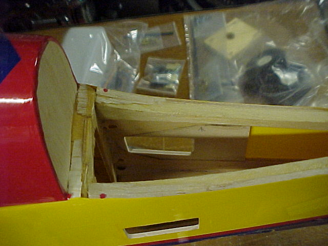 Now......the hor/vert stab install is a whole different thread...I was disappointed with the fit from the factory...it just wasn't going to work out of the box. The book does mention some trimming..........it just doesn't say how much. That takes some careful planning to get a perfect fit(wood to wood with no gaps) of all tail components combined. Just take your time with it....you want good solid joints in there...it's very possible, but does take a touch to get it nice, you'll see what I mean. There's where a bit of building finesse helps...I'm going with my tried and true Moki 1.80 so I want a very good fit........good luck to you..I hope this helps.