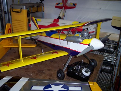 I opted for the WM Ultimate 40s. I started with an OS .50sx and a 12x4 APC but recently switched to a 13x4 APC. I like the 13 far better. The speed this little bipe wants to fly at is amazing. I have my battery in the fuse behind the lower wing to achive balance and thats a 1700 MAH 6V Nmh pack. Anyway the WM 40s has put up with a lot of abuse (aka hard landings) with no damage other than having to re bend my landing gear. It would have ripped the gear block out of most ARFs. Anyway after I figured out that I set my Expo rates the wrong way (made it more sensitive to inputs) I fixed that and this bipe is a pleasure to fly and always a croud pleaser. Oh and the 50sx with either prop gives this bird rocket like virtical performance.
