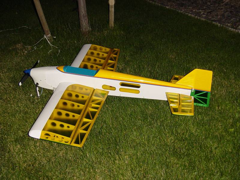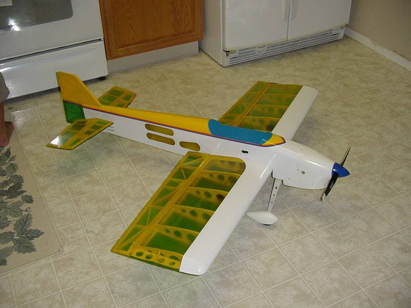 I think I put the battery under the fuel tank. Were you able to figure out some way of using longer servo arms to get "3D" throws, or do you plan on sport flying only? I think I mentioned in an earlier note that the servos are too close the fuse sides to allow for long arms. One guy suggested stacking one servo above the other, but since this was a raffle plane, I didn't go to that trouble.