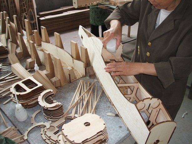 1 person Operating the Laser Cutter to feed all of the people and for each model there is 1 person building all components, 1 person covering & Finishing and one person painting - that particular factory specialises in F3a and 3d models and only builds around 5 of each model per month (about 8 models in their range) and they are as good as any Kit I've ever seen built. In the meantime they keep the laser cutter and packaging people busy making "Foamies" for another company.