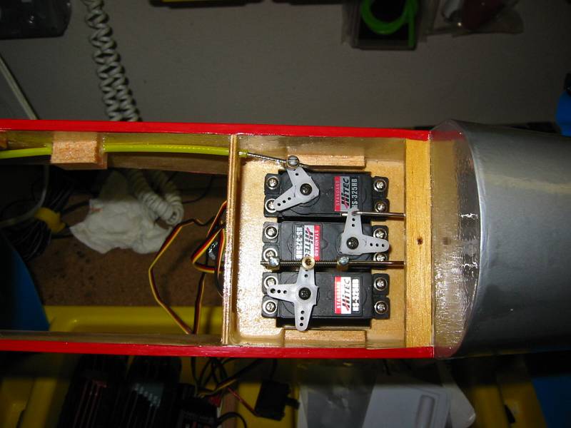 I installed the HS81 servos, however I did not glue them in place. Instead, I added 1/8 stock to the grooves to hold them in place with the balsa covers over them. This is made possible because instead of using the plastic covers I made new ones out of 1/16 sheet balsa and covered it with Monokote True Red. Then I added the push rods and screwed the covers in place.