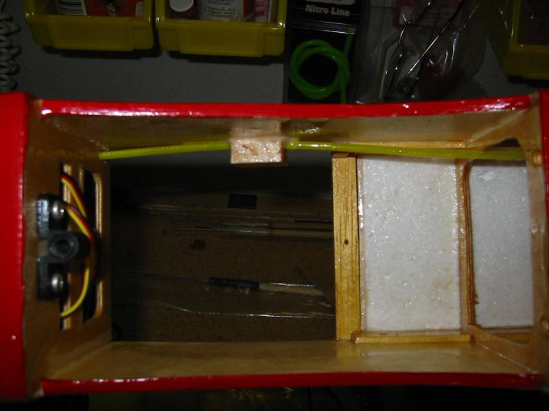 I started the build by using 30 min epoxy to coat the inside of the radio and fuel tank compartment. Then I installed the Throt, Elev, and Rud servos. I replaced the push rods with carbon fiber and used a Sullivan .56 push cable for the throttle.