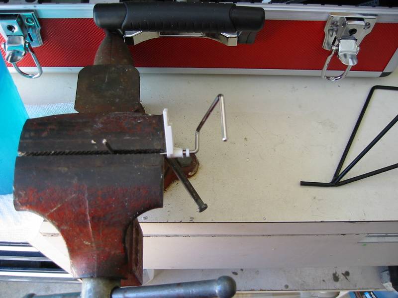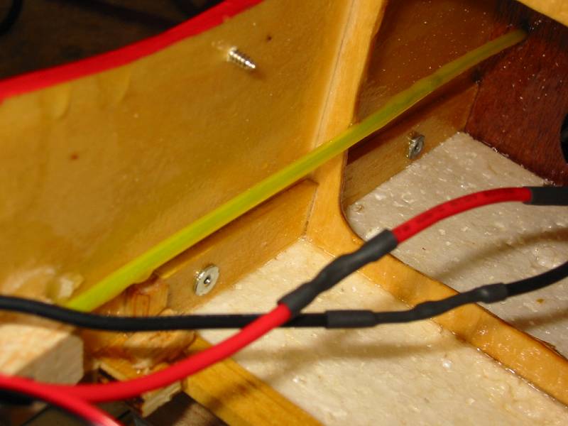 The last modification I did was to add guide wires. This required a few modifications to the fuselage. I replaced the carbines wood screws with 2-56 hex cap screws with blind nuts. The wood striped out easily, so this was necessary. I fashioned guide wire holders using electrical solider tabs.