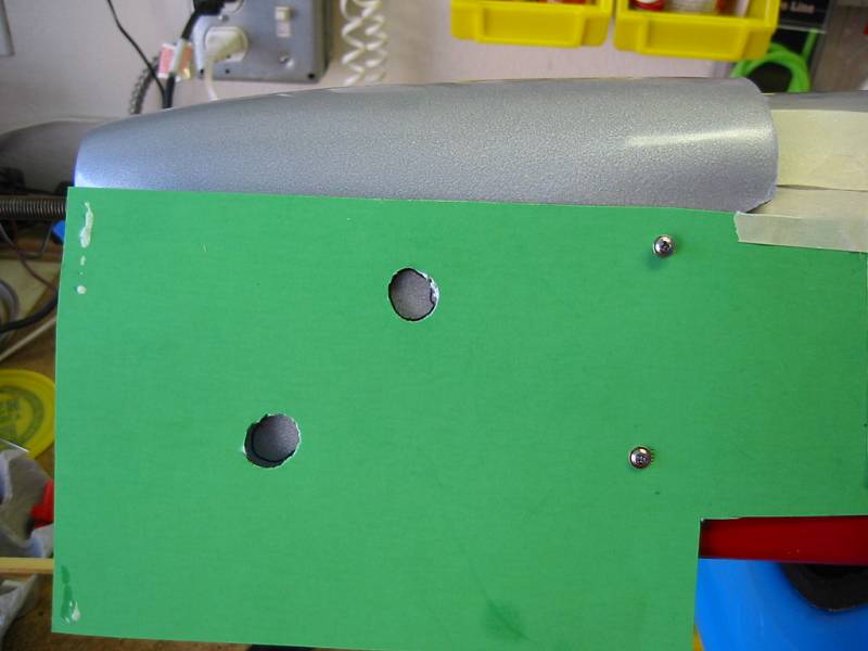 After the detail work on the cowling, I made holes for the needle valve and the low idle adjustment. I figure once the engine was installed and the cowl on, it would be too much of a pain to adjust the low idle. You may not want to do this for looks, but with the muffler and prop on, I did not want to hassle with it. This is a new Saito engine and I know I will have to make subtle adjustments. Taping card stock to the fuselage, I made the marks for these holes along with the hole for the muffler. Reattaching the cowling, I transfer the marks and then cut out the holes with a Dremel tool.