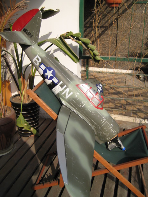 Haven't done any cosmetics on the frame since the previous photos but planning to add the four .50 cal machine guns in each wing. The sticks from the chupa chups lollipop candy are just right! Have eaten 8 this week and collected all the sticks. Painted them gun-metal and will glue them in in each wing. Wife gave me the looks while I was happily chumping away on the candies and still refuses to believe that I really needed 8 for the plane. Her point is that 4 will do since they are meant to be cut in half at least... Darn her