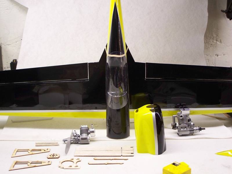 My original intention was to use my Saito .30 in it, and around 9 oz this was looking to be a real strech. So my next move was to loosely assemble it and try to get a rough idea of what it would take to balance it. I got everything in place, the Saito and cowl taped as closely into position as possible... -wow! Not looking too good, so I swapped the Saito .30 for an as yet untried (NIB) AP Hornet .09. Hmmm, still looks like it's going to be a challenge so I took another tack and removed the existing motor mount. This was scary-easy, just a little wiggling here and there and things started to crack loose. In under 5 minutes I had the mount removed and also the floor of the fuselage.