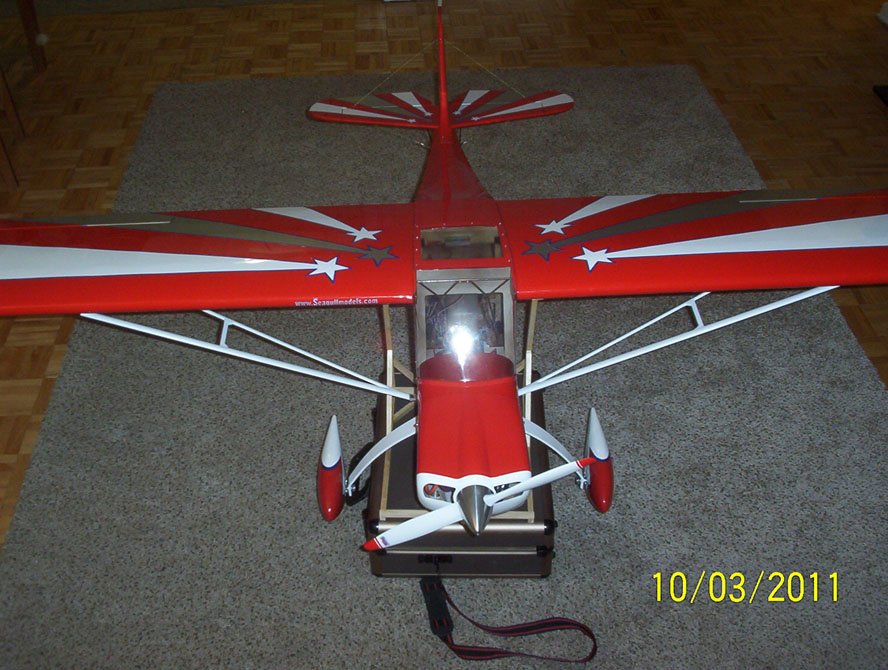 Gave her a Maiden today, She flys nice I just had to put a bit of weight on the tail but now its good. Had a reciever problem though I run with a Spektrum 8 and was useing AR6200 reciever, even though my transmitter was returned back to Horrison I still have a Backwards compatibility issue So have changed to the AR8000 and now have no problems....