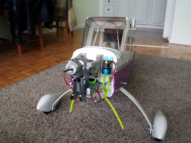 Another gas powered Decathlon was offered up to the flying gods yesterday, and arriving back home on terra firma safely, despite very windy conditions! Thankfully they were blowing right down the runway. There was enough wind on a couple of landings to permit a 20-30 foot roll out! The RCGF 20 was proven to have plenty of power, offering unlimited vertical, though maybe not enough for all out 3D. Using an APC 17x6, but not tached yet. Plenty of ground clearance. The engine was very easily dialed in and the second tank of fuel was spent in the air. Suggested CG has proven fine, maybe a hair nose heavy. Suggested aileron throws for low rate not quite enough for me, but fine for the test flights. Knife edge coupling, holy cow, had forgotten how bad they really are. Going to take while to figure out all of what needs to be done there! 4 tanks of fuel with it has let me do a little engine tweaking, a little fiddling with the radio, and the plane is already settling down into what I think is going to be a great little flyer. Very happy with the plane overall. -Al