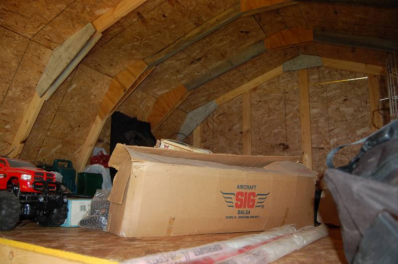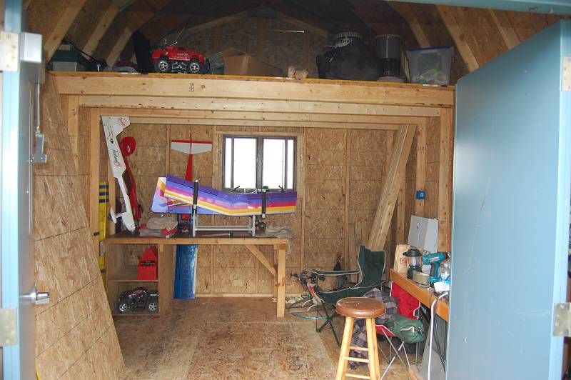 Well, finally some pictures to show progress. Got one coat of paint on the exterior. For now we are sticking with just painting the outside. The loft is up also. We are going to get another coat of paint on the outside, get the electrical done and start moving in. For now, pics. (Final two pics are of our previous R/C work place)