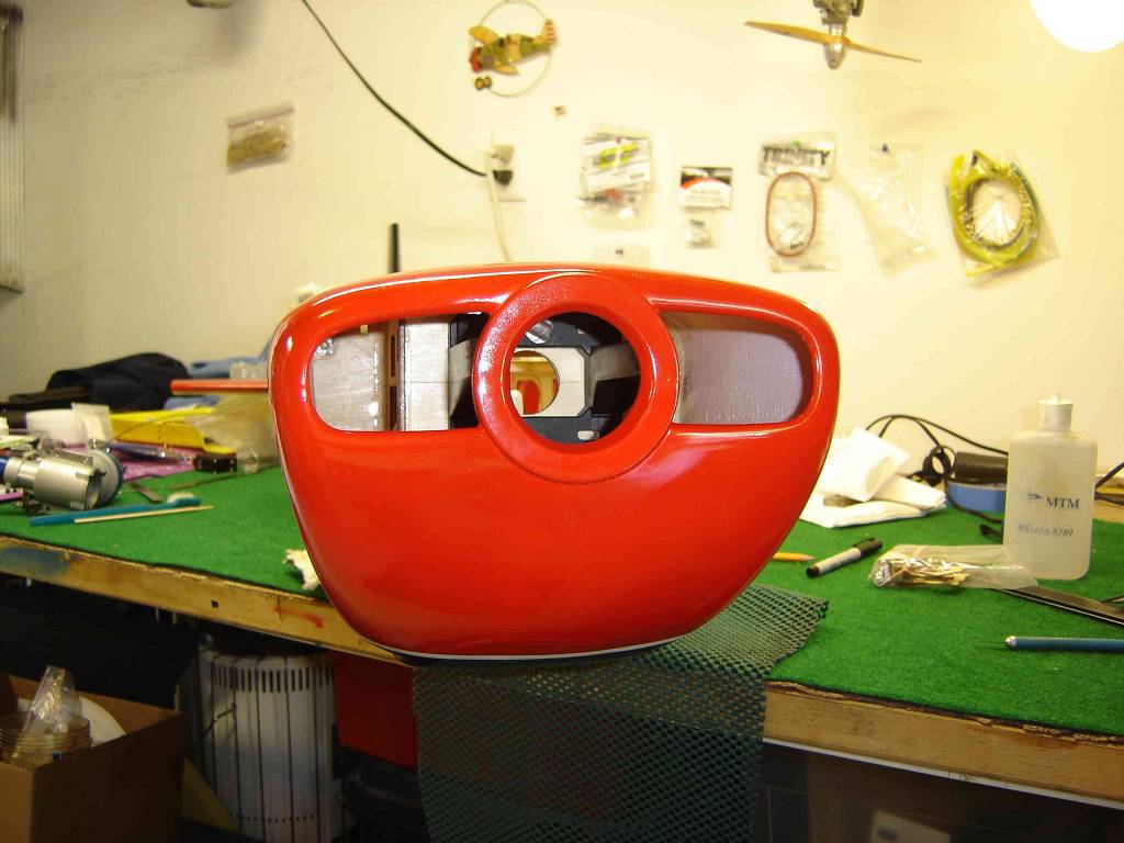 Another fine point is the excellent cowl mounting systems beautifully matched paint colors and perfectly aligning trim lines. I decided to install the engine and cowl before adding the tail feathers because it is so much easier while the fuse is siting vertical on the floor to measure and align everything. Well let my go back to trimming the cowl. I have the engine mounted and need to cut the breathing holes for the engine. Regarding the engine install; I substituted the engine mount for a GP 120-150 adjustable mount (my predilection) although the provide mount will work just fine. I am also using all SAE hardware on the engine mounting, and that is just another preference. I drill and tap my mounts and Metric taps are very hard and expensive to obtain. Until next time.....................happy building!