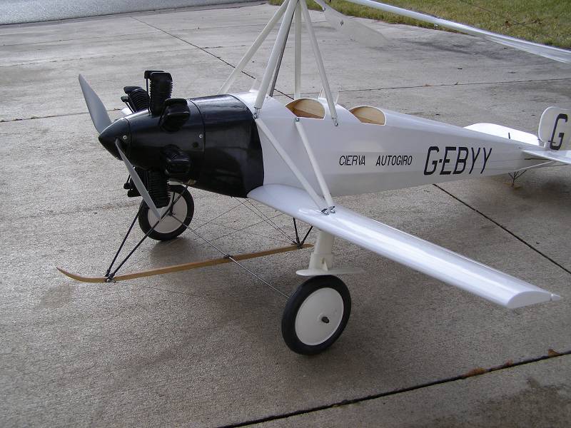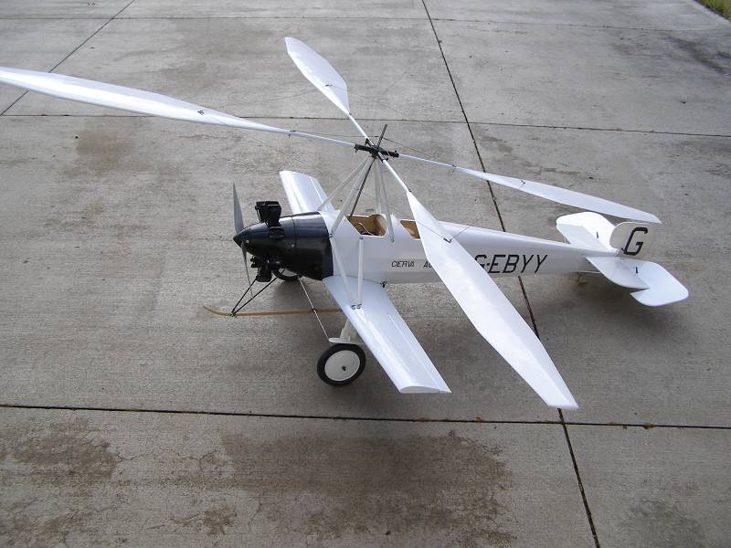 Here is photo of my other Autogyro. Scale model of CIERVA C.8L-II with 76” diameter of the rotor (1:5.5 scale). The model was built from the balsa, plywood, steel and carbon fiber. Flying weight 8.5lbs. Power AXI 4130/16. Will be test flown in the spring 2007. Some tests were done already. The rotor was tested on the windy day to find out if there is issue with blades tracking properly and if there is vibration. There was no problem with that. The rotor generates lot and lot of lift. The rotor mast can tilt 7 degrees left to right with heavy duty servo. The advanced blade can flap upward by me using thick wall carbon fiber tube for main spar. The downward travel is restricted by steel cables. I have seen full size C.8L-II hanging in Paris museum.