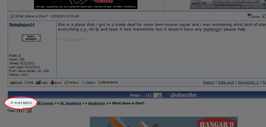 well i already have a hobbico super star with o.s. 40 la that is older so that is the plane that i mainly fly but this unknown trainer has an o.s. 40 fp on it and a laser 4 brand hew high tech transmitter so im not going to fly it untill i crash my super star i also have a cessna 182 skylane total of 6 transmitters 20 extra servos and bunch of other stuff