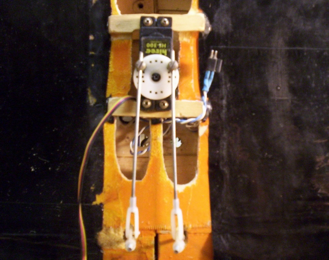 As I mentioned way back when you started building this kit, the Kadet Mk II is a very old design and did not anticipate things like dual aileron setups. When this plane was designed, a four channel radio with servo reversing was very delux. If the user wants to use dual aileron servos, it is up to him how he implements them. I just made up ply plates which I set into the wing about half way along the wings and operated the aileron horns with metal pushrods directly.