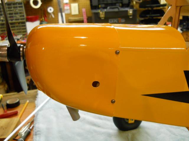 . Look at several J-3 Cub cowls from the head on view and you will see most have three openings just below the spinner. The top one is the widest and is a horizontal slot, below that is another horizontal slot less wide that the top one, and below that is a square or rectangular oil cooler opening that will be in that raised area near the bottom front of your cowl. Some don't have the oil cooler bump but yours does. After laying out how you want to do these, cut them open so air can enter the cowl for a little additional cooling. The unused muffler tunnel plus the area around the exhaust pipes will allow plenty of air exit from the cowl. General rule of thumb is to have twice as much exit area as intake area for air flow cooling. you have plenty. This will also give a more correct scale look to your cowl. You have a nice looking plane going there. As to the fuel tank fueling; has the tank been assembled yet? There is a 2 fuel line system and a 3 line fuel system. The 2 line would use a accessory fuel valve (Dubro or Great Planes) that would be mounted somewhere on the cowl like the side or the bottom and it consists of a spring loaded valve with hose fittings inside the cowl to the tank on one end and to the engine on the other end. A metal fueling nozzel for the end of your fuel pump hose is supplied with the valve assy. They work nice when they are new but will stick open when they have a couple of years on them and will require replacement. The 3 line system has an extra line going into the tank and will require a "fuel dot", also to be mounted on the cowl. The fuel dot is just a nice finished looking spot to mount an exit spot for the extra fuel line and will have a nice machined plug for the end of the fuel line plug. 3 line with a fuel dot will be cheaper @ $4-$6, and the fuel valve will be about $12-$13. Both available from your hobby store. Some just let the extra fuel line hang out the bottom of the engine bay and plug it with an old screw. YUCK, YUCK, looks non scale and sloppy, but that's just me again! The dangling line with the old screw plug works but come on you can do better, Go with a nice fuel dot or fueling valve.