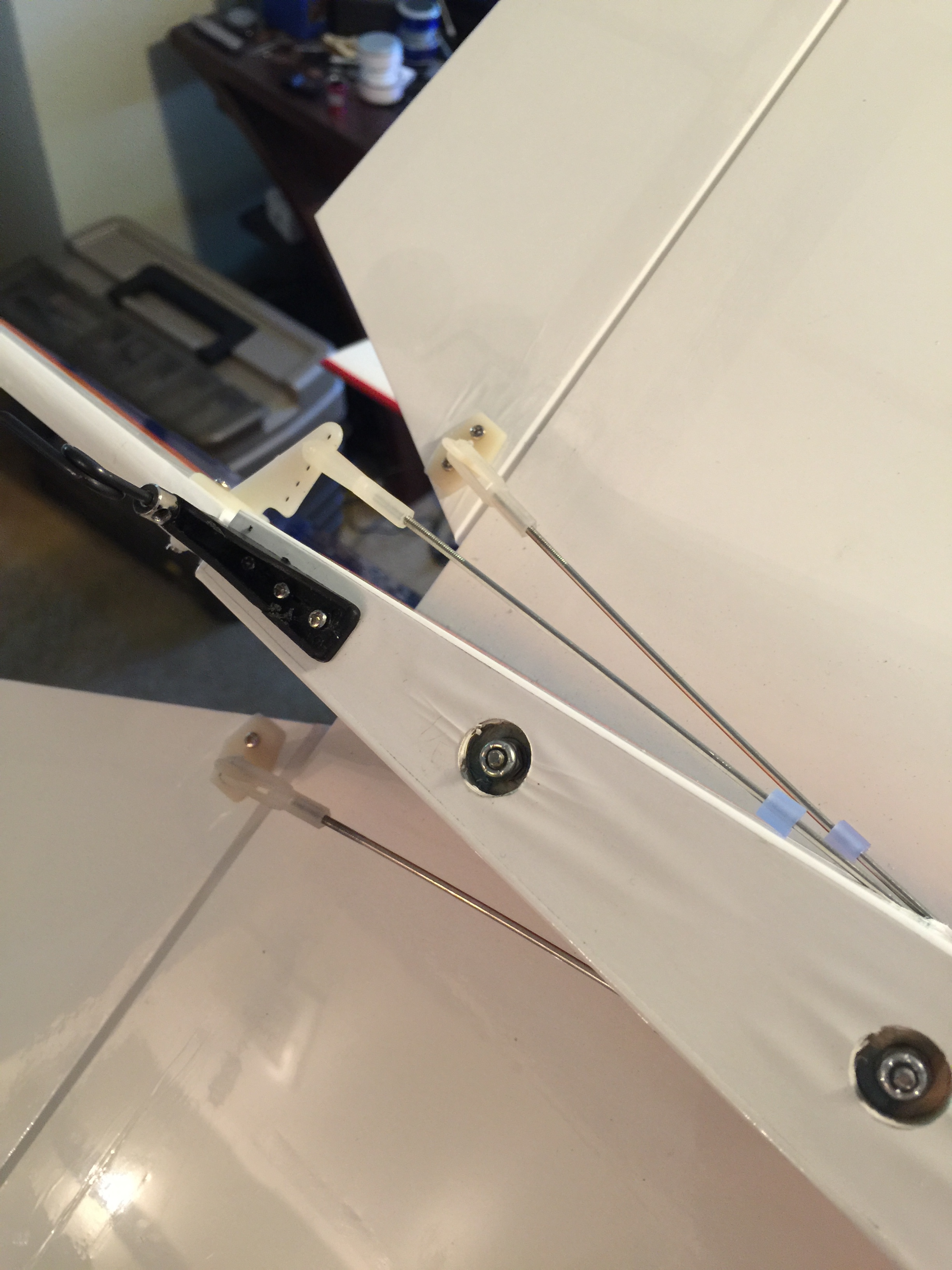 7. Now hook up the elevator pushrod assembly as you did for the rudder and test. Keep moving in towards center one hole at a time until you get full travel and no buzzing.
