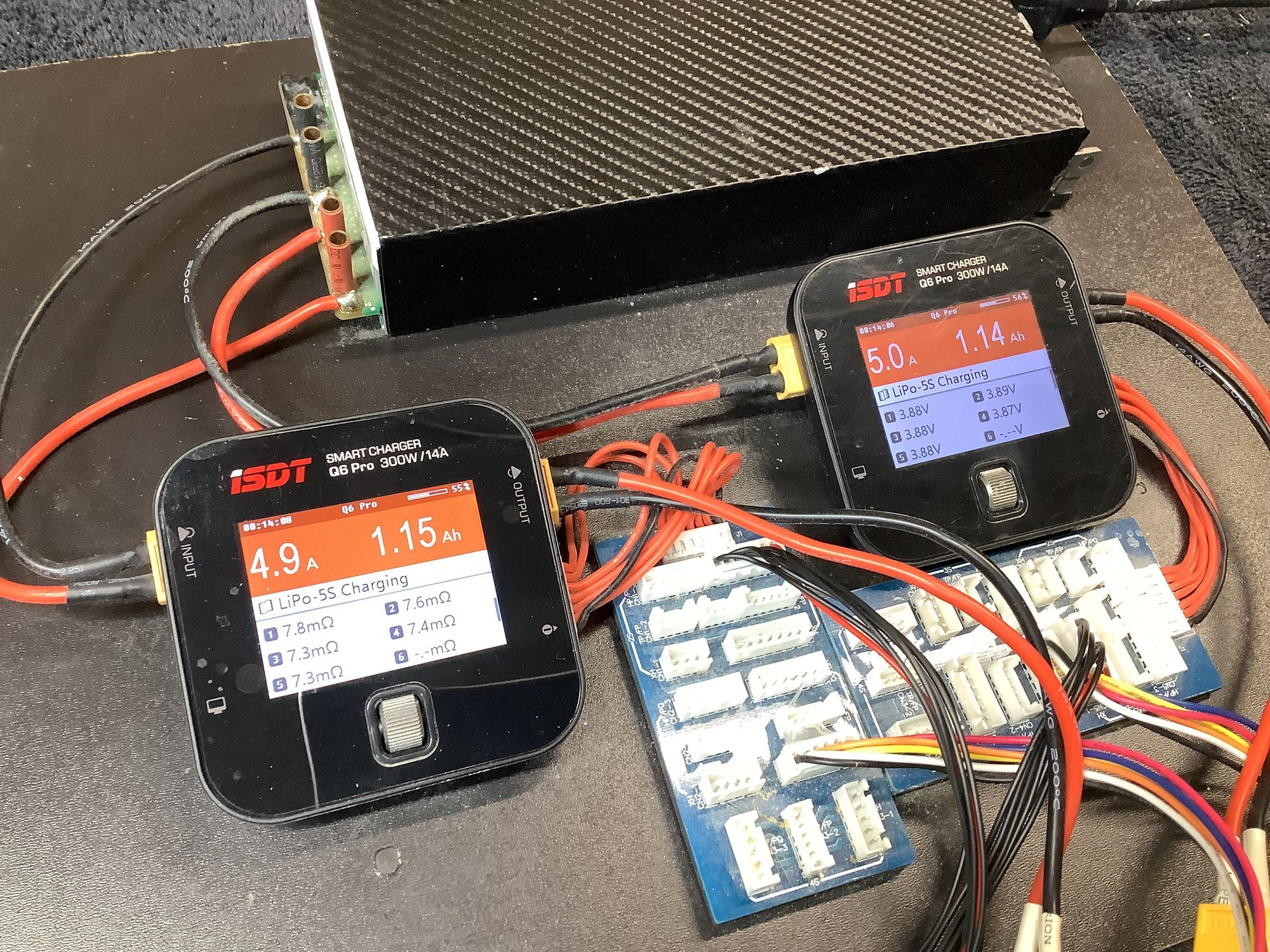 There are lots of options out there and to be honest I haven’t looked for a charger since 2019. Reading between the lines there I hope that you came to the conclusion that I have been using the same charger(s) for 5 years now. My chargers are ISDT Q6 chargers. They are not overly expensive and do a great job but most of all have the safety features that IMO are needed. The bad news is that they are DC only. As you can see from the picture, I run mine off an old converted computer power supply. Easy to obtain one that will put out 15V to 20V at 400 watts. You will also notice the use of balance lead adapter boards and that the chargers are in two different modes, those safety features I mentioned earlier. Every charge I not only check the voltage of each cell but the internal resistance of each cell. If they get to be too far off from one another, it’s easy to catch before a fire can result.