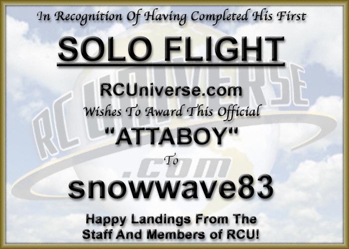 I also Solo's 3 hours later after a long day with waiting for my glow started to recharge, I forgot to charge it last night. Later in the day when one of the instructors showed up he took her and go her into the air into a 7mph crosswind, handed her over to me, I did some figure eights, a couple loops, and 3 or 4 rolls and then brought her down nice and smooth, after I fueled her up the instructer said I was learning extrememly fast (second day at the field or flying EVER) so he siaid try taking off, I have the landing down good. So I tool off into a 7-8mph cross wind, did a couple turns and loops and brought her in really smoth. If earlier I did not earn my wings due to a dead engine, I think I earned them later in the day with the engine.
