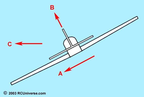 When the wing is banked, the plane still wants to fly straight. However, as gravity pulls the plane down, it will want to slide in the direction of Arrow "A".
