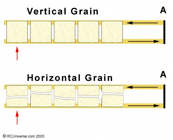 If the forces are at an angle, and we all agree that balsa failes more easily along the grain than cross-grain, then any failure in the web should show up at a grain-wise crack. If the web is veritcal, the crack has little effect, since both ends are still glued to the spars. If the web is horizontal, even a small crack disconnects the top and bottom spars