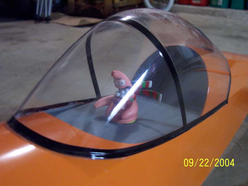 Ok fellas. She is almost done! I figure a couple hours a night and we'll be in the air in about two weeks. The pilot, Patrick, is a little small but those of you with small kids understand the meaning to them. I was going to tint the canopy, but read some horror stories about tinting and didn't want a lump of tinted plastic. Still have to do all the llinkages, cover and install ailerons, install radio, final balance, stickers, engine break-in (TT Pro .61), and final shake-down. Then she will be airworthy. Anybody got a good line on some wheel pants that will fit with little modification and are reasonably priced? Let me know. Enjoy!