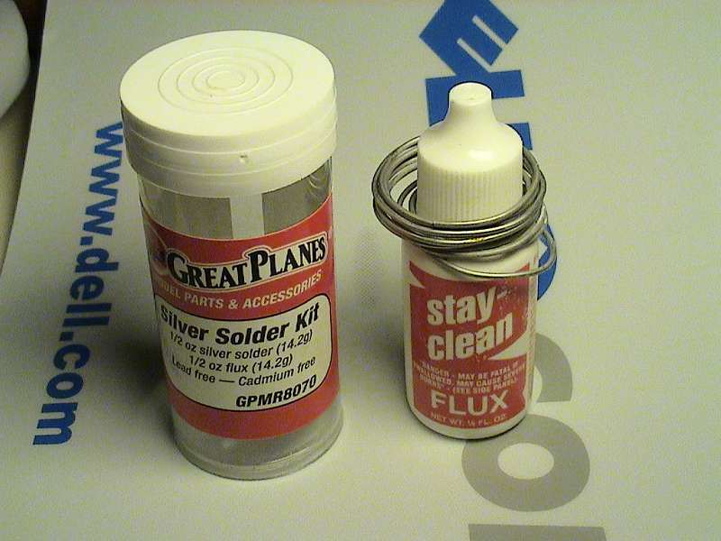 I also recommend that you get the Great Planes sweat solder, with acid, this stuff is also called Stay-Brite and is superior to any ordinary sweat solder, much stronger and much easier to use as you don't have to clean the piano wire before hand...just pour the acid on and solder.