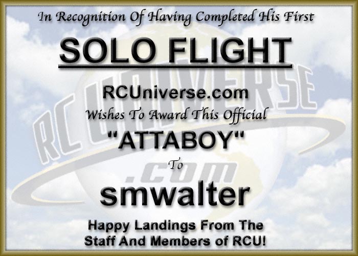 smwalter, congrats on your first successful flights!! Sounds like you are doing well. Now just for something to think about. I have heard more than a few times somebody suddenly yelling "does anyone see my plane?!?". This is because their plane got a bit too far toward the sun. Get a hat, make it a big one like the Aussie style that you can clip up one side or the other, not a baseball cap! Spring is just starting and you are just beginning to get in stick time. Sooner or later something is going to happen and you will find your plane heading toward the Sun. If you have the big hat on then its not such a big deal. The wide brim keeps your eyes in the shade and you can correct the situation. You can fly toward the sun if you have to by making sure that the plane is below the "brim level" of the hat. The wider the brim, the higher you can fly. No hat and all of a sudden all you see is bright glare followed by the sound of a crash!! Another thing, this hobby gets us out in the sun for days at a time and the UV rays aren't as friendly as they used to be. A wide brim hat will keep the sun off your face and your neck. [8D]I never train anyone unless they are wearing a hat. I bring spares so no excuses!
