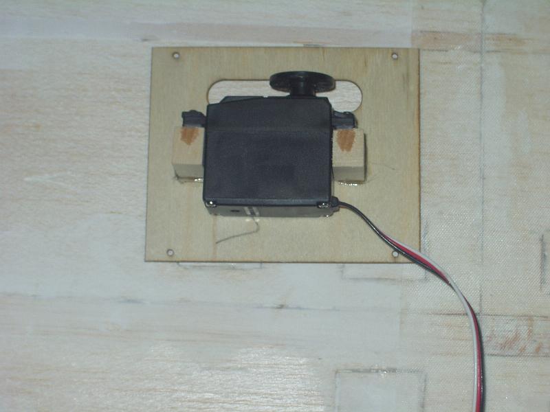 The first pic shows the left-hand aileron servo from the top of the wing. The servo is mounted to 2 small blocks of balsa first (using the supplied screws and grommets), then the 2 blocks are glued to the servo hatch cover (with is lite plywood - 1/16" I believe).