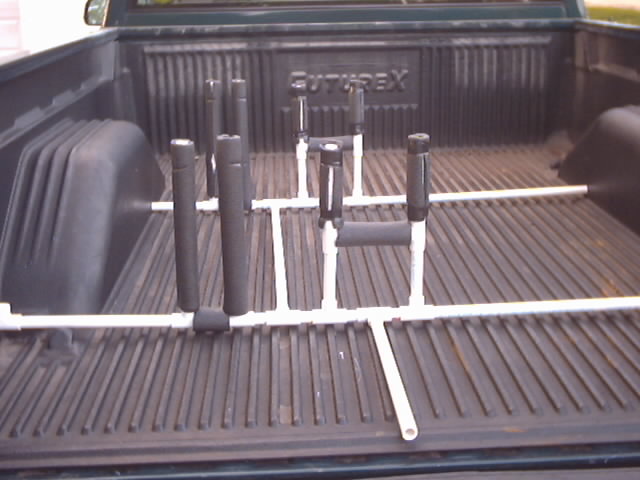 This is the picture of the pvc holder I did but it is not my design totally I did a search on RC and found some others who did this and custom made it for my plane and truck bed its 1/2 pvc with wrap for where the planes pieces sit and the bungee cords are for going over the body of plane and wrap around the poll to keep it in place the wing goes in the tall pieces of pipe and a small bungie wrapped around the top keeps it from going anywhere. This was my first outing and first flight today I had to go 30 miles one way and 55 most of the way and everything rode great. The two flights I had today with an instructor went great did my left hand turns and then right turns and figure 8 today and some 40 foot runway passes to get the feel for landings.