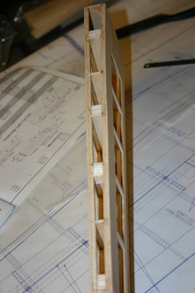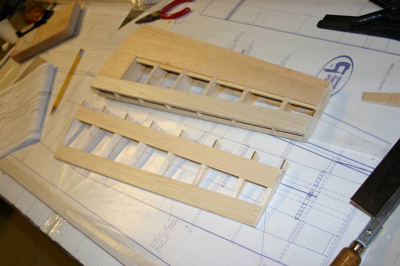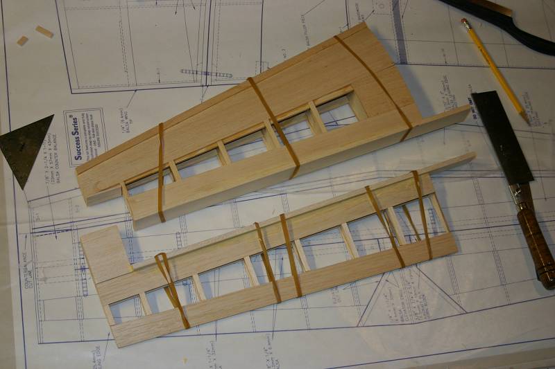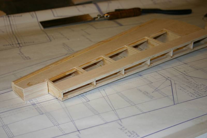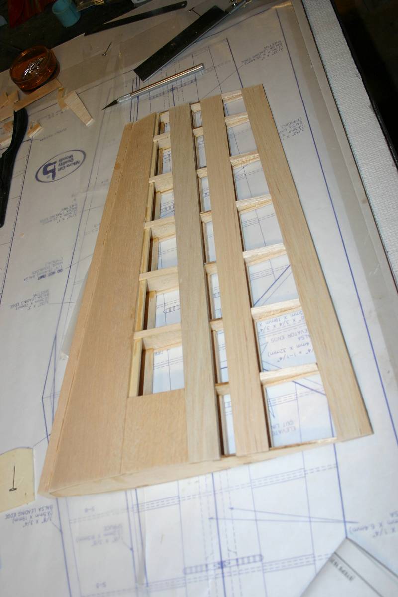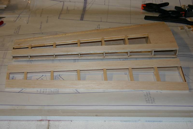 This one is the stab with all sheeting on the top side and the rib cap strips installed. The upper left and the lower bottom cap strips are left off until later.