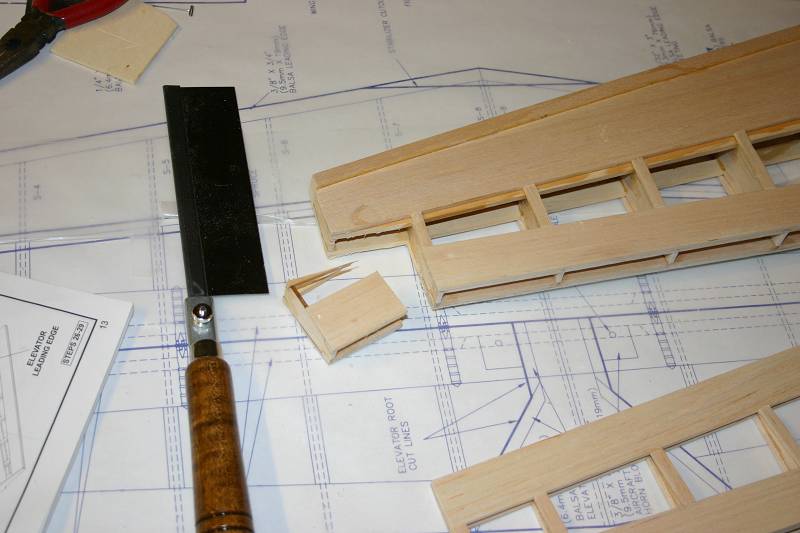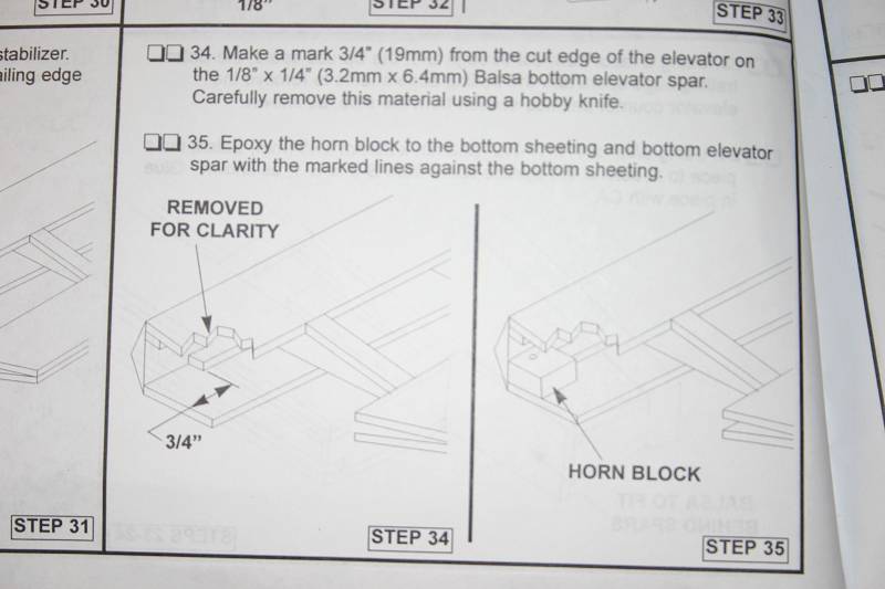 In this picture on the right, step 35, the horn block itself looked to me to be a little short. I plan on using a horn assembly that goes all the way through the the elevator, like the central hobbies one in post # 10. I would modify by using a 3/4" dowel flush with both surfaces and then drilling to accommodate whatever hardware is installed.