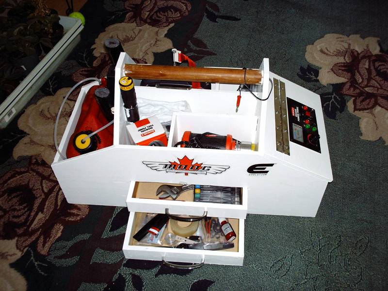 I built a convetional field box from plywood and particle board (heavy!). Then, I got a tackle box from Wal-Mart, and now I wind up carrying both to the field. The tackle box is for spare parts and stuff, and the convetional field box is for fuel, Windex, rags, glow drivers, and the starter. BTW, the starter changes homes every once in a while