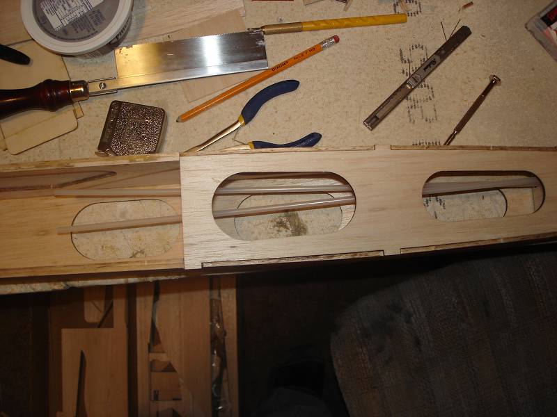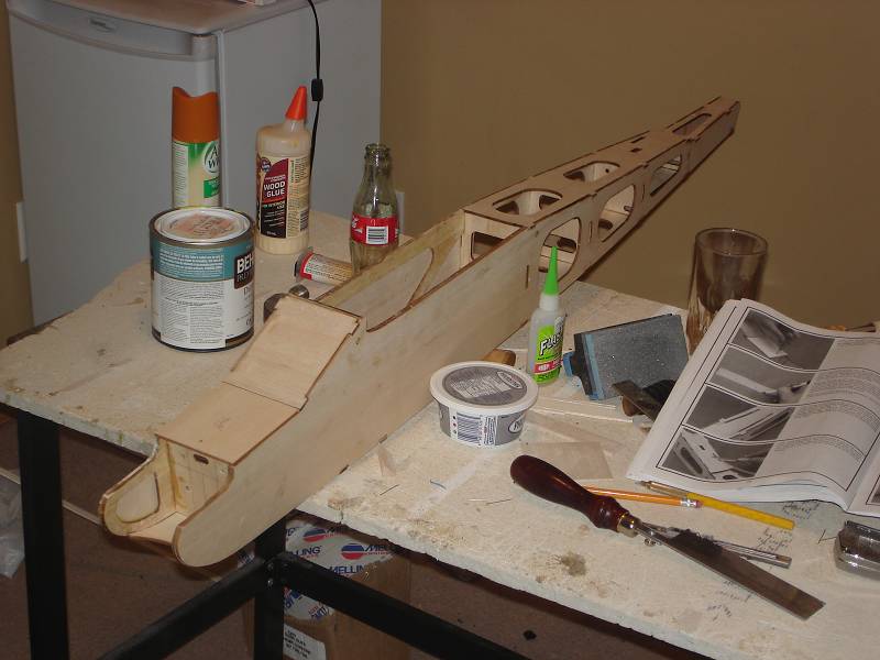 ive glued the fuse together, installed and epoxied the landing gear block and installed all the triangular stock for support on the firewall and landing gear, installed the windshield, fuel tank floor and bottom formers and installed the pushrod sleeves. im just starting to sand the fuse, but will wait on any final sanding/filling of repairs until i have the covering. so far i only have to drill the holes in the ailerons for the control linkages, fiberglass the center of the wing (can anyone tell me the best way to thin out epoxy) cut slots for hinges and sand all the parts one more time.
