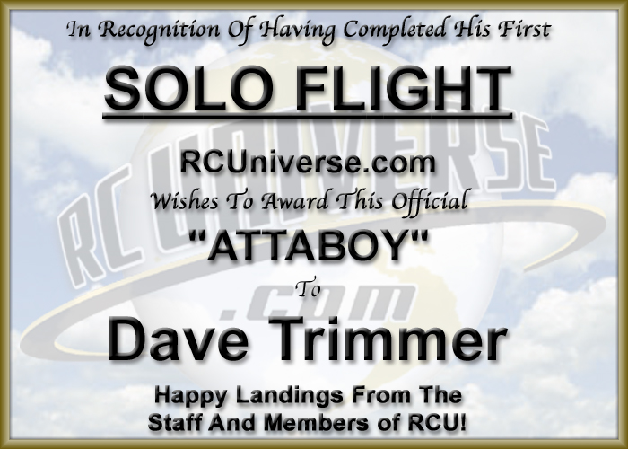 Congrats Dave. I'm glad you had such a terriffic day. It will stay with you for the rest of your days too. Getting your wings with your first solo flight is a great accomplishment. Well done. I hope you have a great time at the fun-fly![sm=thumbup.gif][sm=thumbup.gif][sm=thumbup.gif]