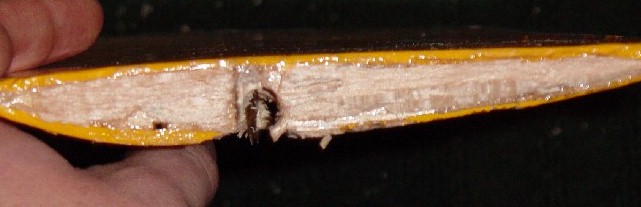 Here is a pic of my wing after the second failure. I Have cut the wing joiner out now as I intend to fix it again. On mine the epoxy joint held firm it just ripped the wing rib out of the wing.