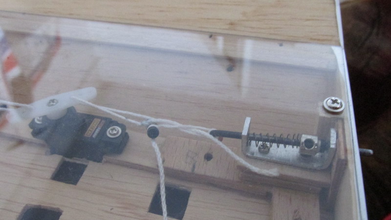 Of course I didn't attached the chute directly on the airframe, I mounted 2 bolts in the landing gear wood block and an aluminium piece from them to the firewall which are the strongest places on the plane. From here two strong elastic cords (from an fitness extensor) go trough the fuselage to the cockpit and another two non elastic cords of different lengths with springs are the second and third impact absorbers. Also I've mounted a slider ring over the 32 lines like on real chutes so that it deploys gradually also reducing the shock. The shock cords go trough two O ring metal shapes that are attached to the internal structure so that if the chute is above the plane the stress will not go on the cockpit panel itself. The entire weight of it is about 600g from which the chute is 450g.